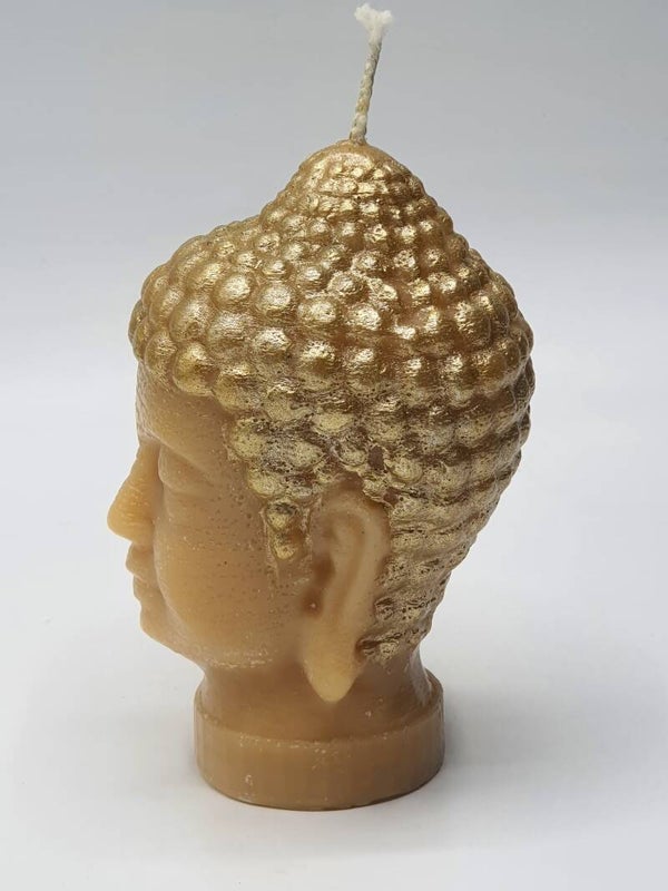 Een grote kaars in de vorm van een Boeddha hoofd met een ronde smalle standaard.