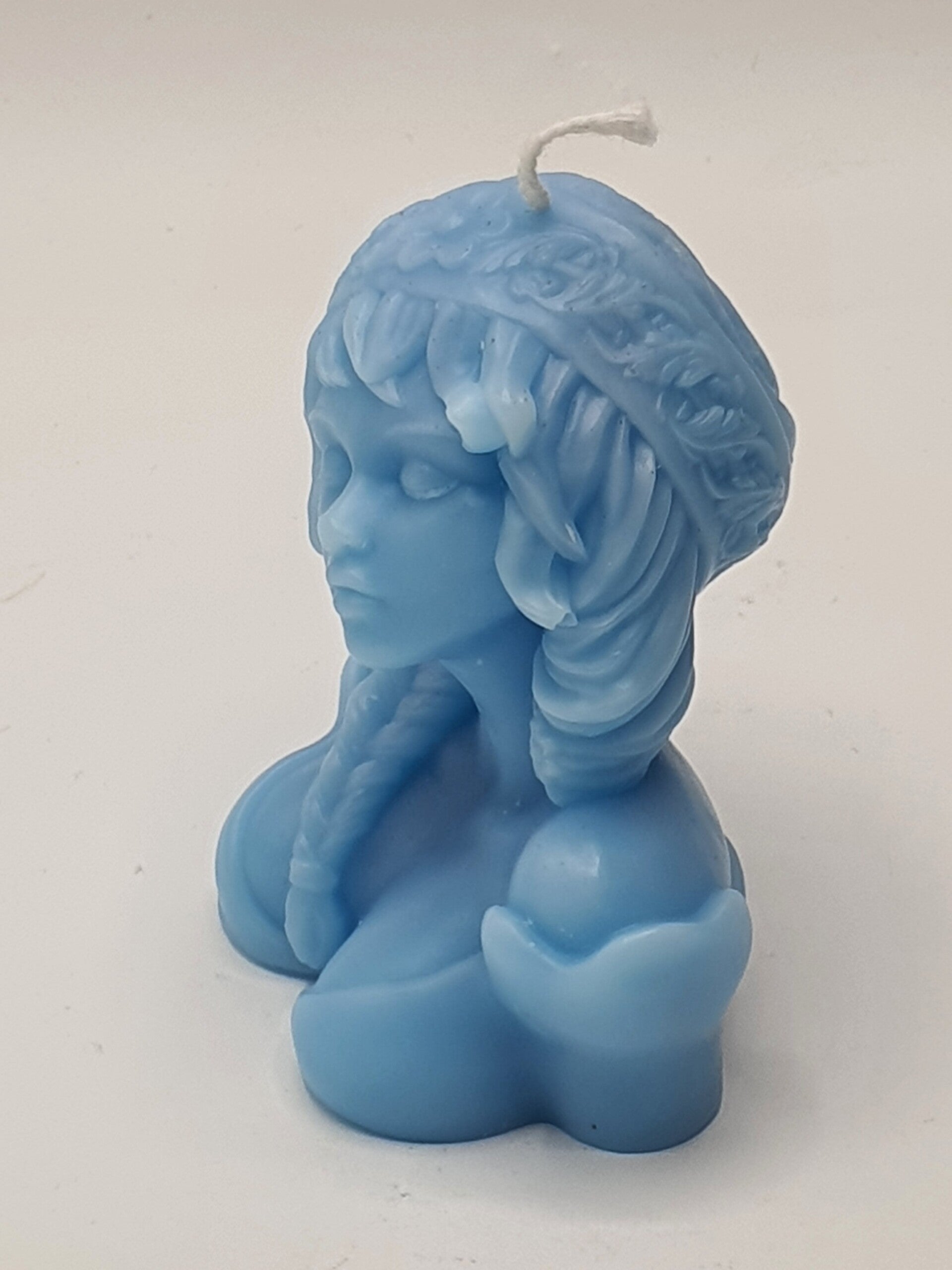 Bijzondere kaars van een borstbeeld van een jonge vrouw met een band over haar ogen waarop bloemen zijn vastgemaakt. De band loopt door over haar prachtig gevlochten haar aan de achterkant.