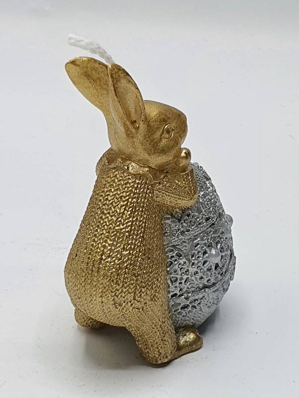 Een schattig kaarsje van een lief konijntje dat leunt op een paasei. Kijk naar de leuke details: zoals het kraagje van het gebreide hansopje en de reliëf versiering op het ei.