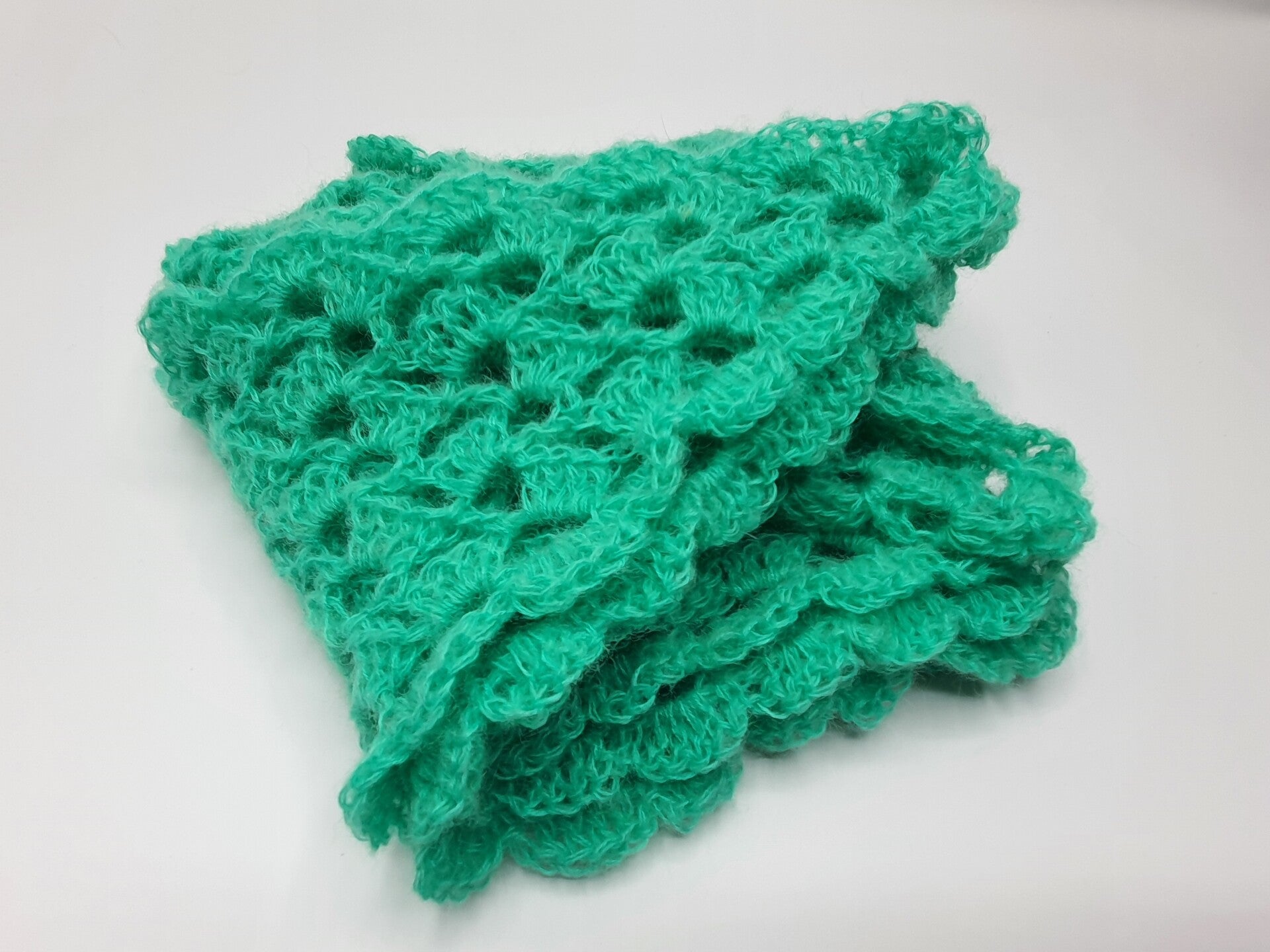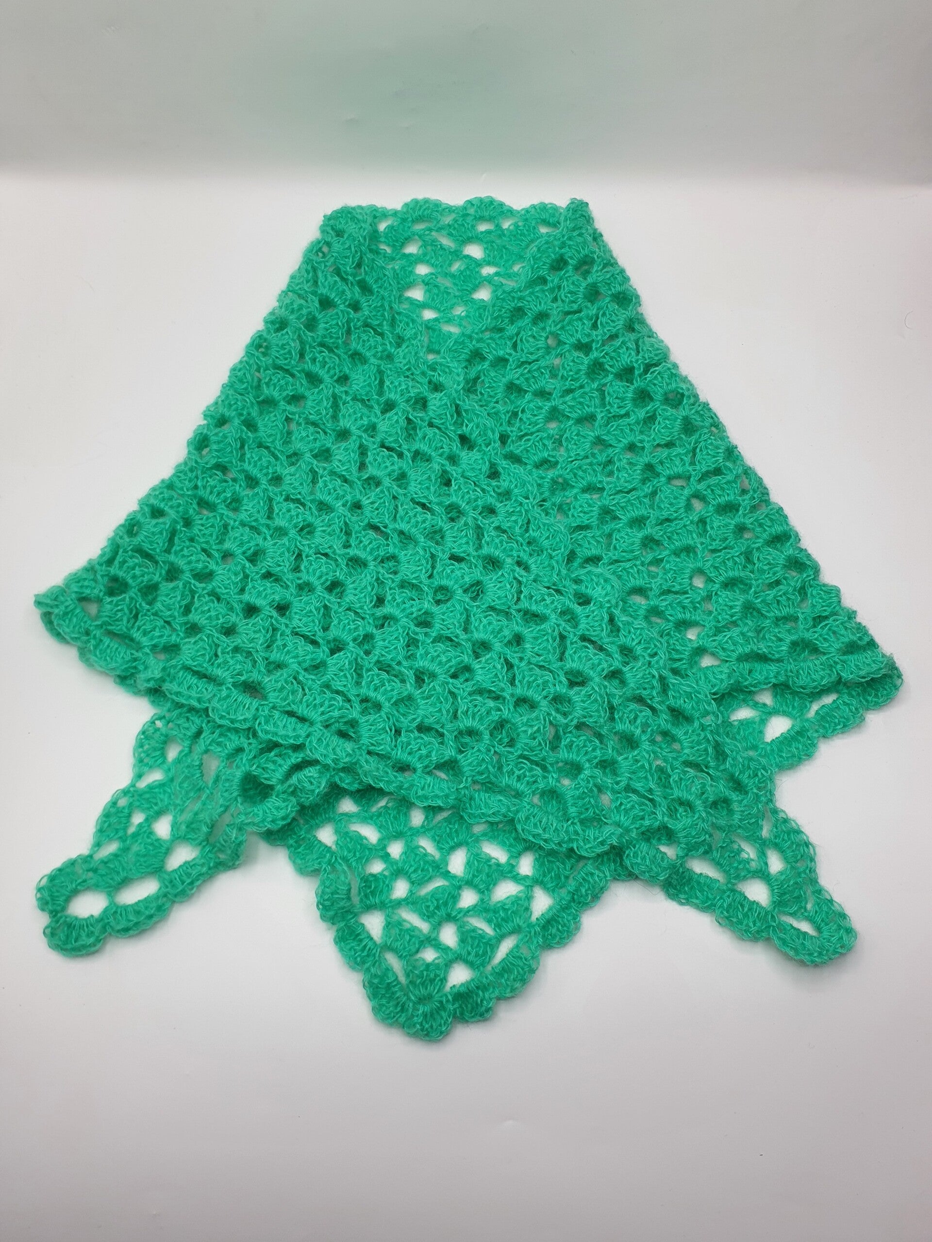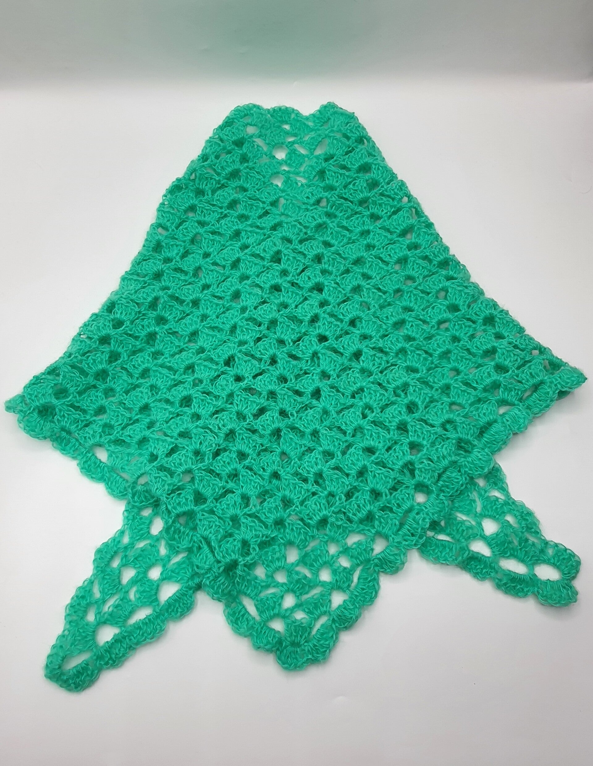 Een driehoeksjaal gehaakt met een open patroon van groepjes stokjes die om en om zijn gehaakt. De sjaal blijft daardoor transparant en luchtig. De kleur is helder Grasgroen. Hij voelt heerlijk zacht; ook door de mohair en zijde die erin zit.