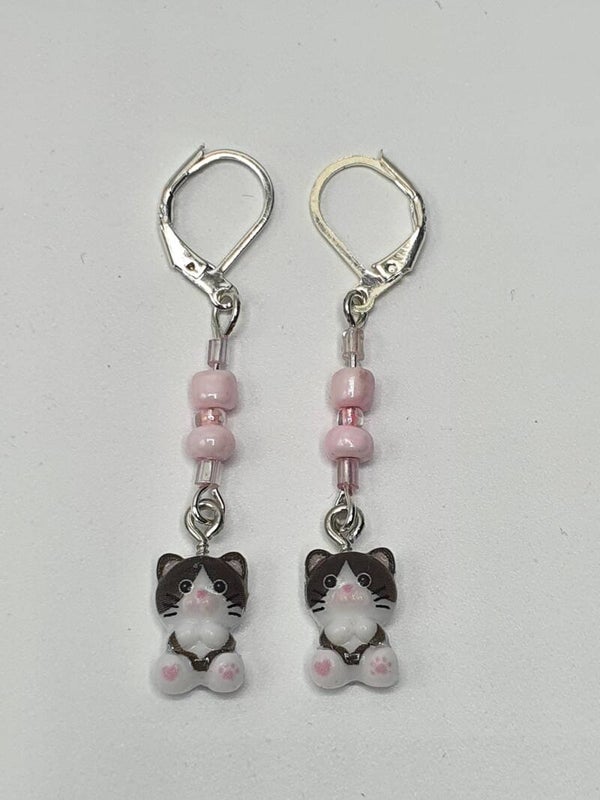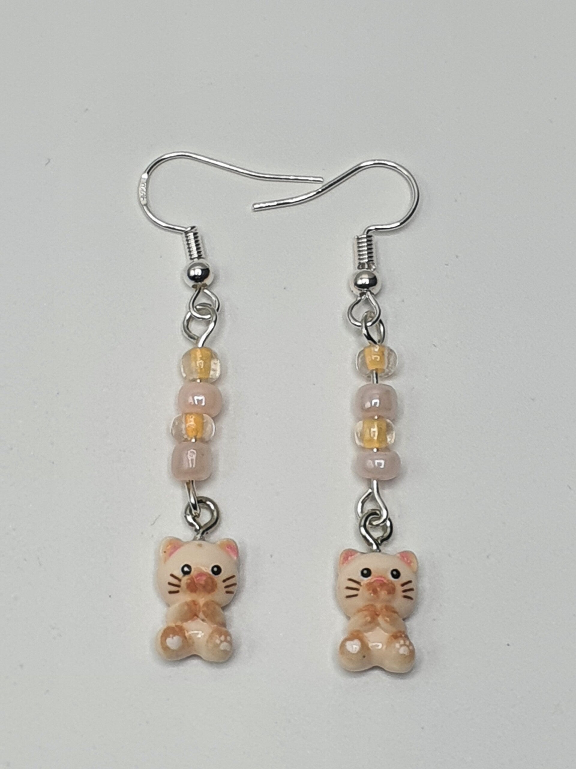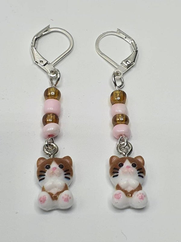 Schattige poezen of katjes oorbellen, hangend aan glazen kralen. Bij de bruin/camel poesjes zijn de glaskralen verschillend.