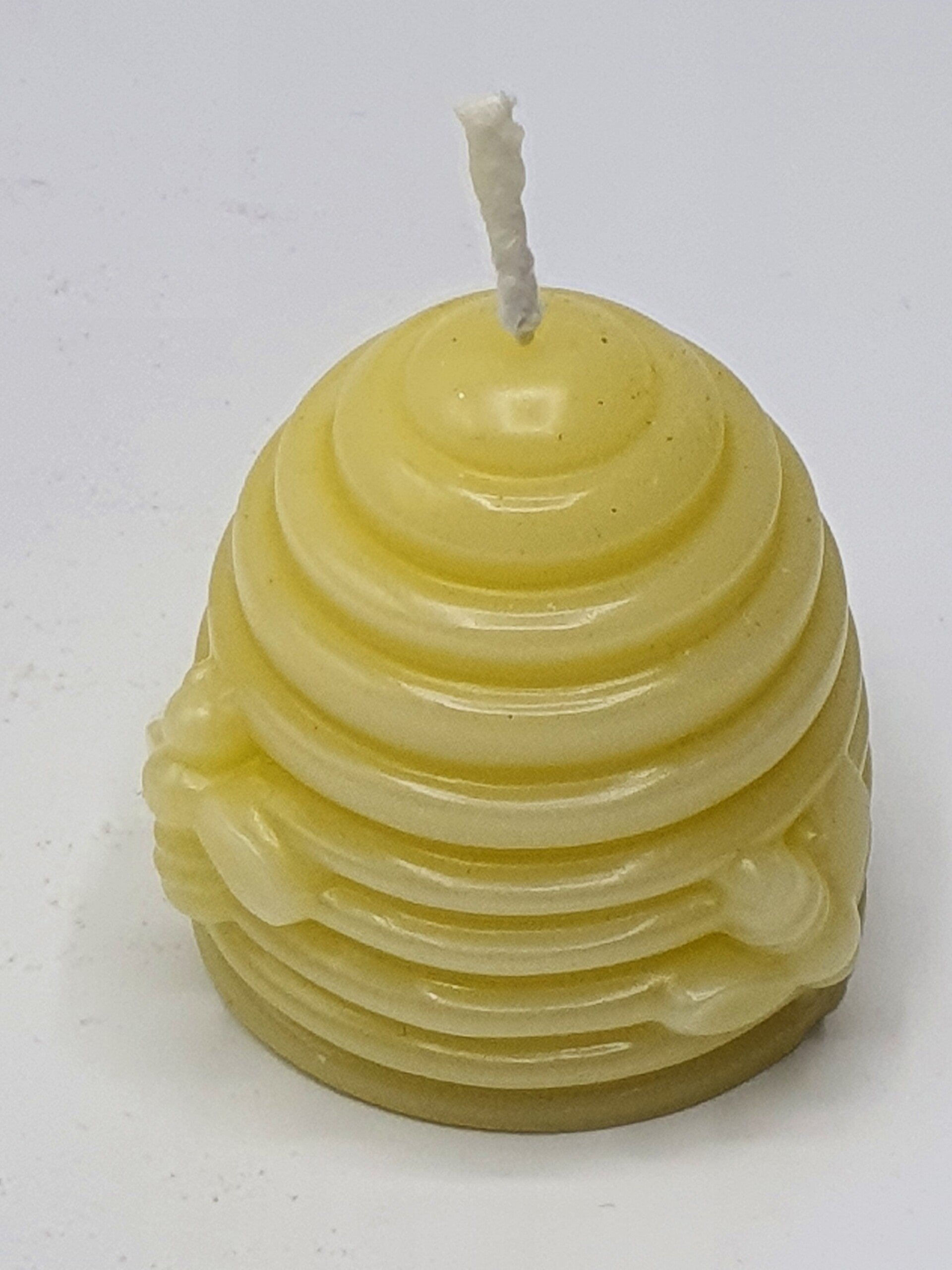 Een klein kaarsje van een bijenkorf met drie bijen aan de buitenkant.